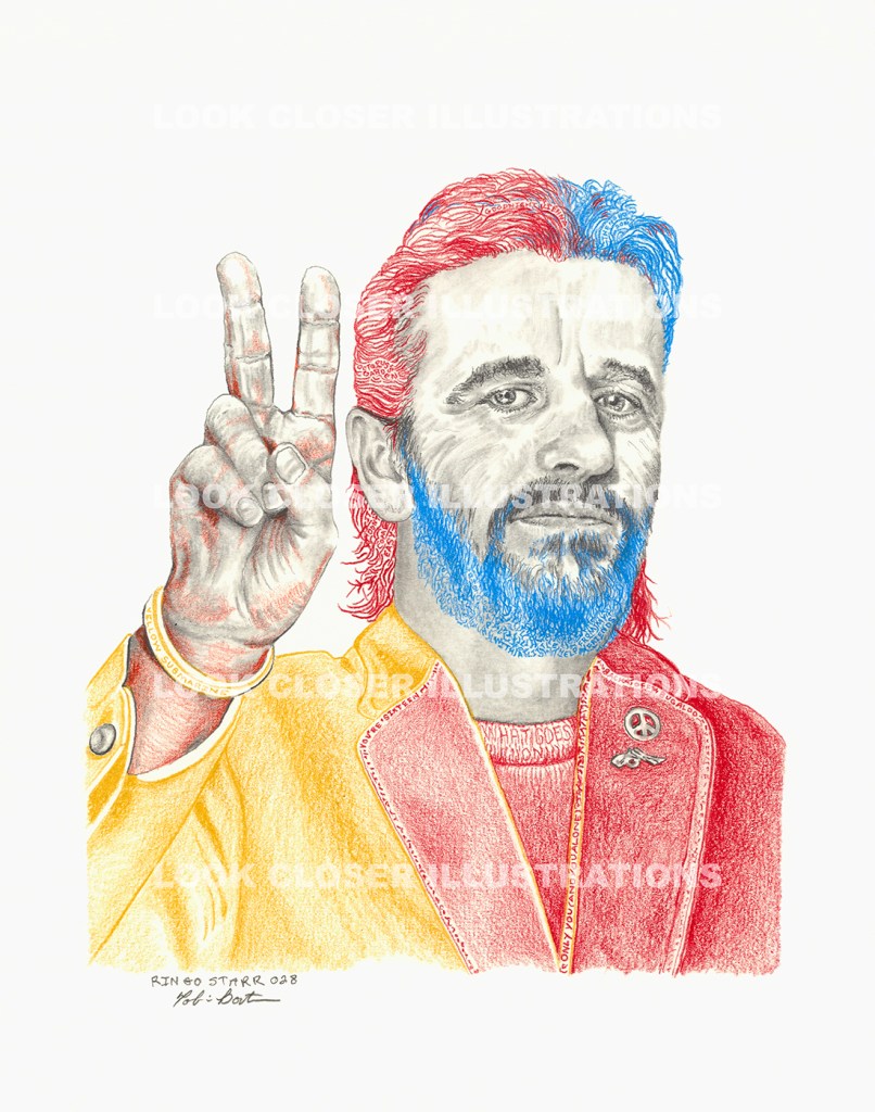 Digital Print on Archival Matte – Original illustration done in graphite prisma colors: Yellow Ochre for singing lead on Yellow Submarine; True Blue for Beaucoupes Of Blues; Crimson Red (or blood red) represents his film contribution in The Son of Dracula. The lapel pins were worn while revealing his uniquely designed replica ‘knotted gun’ statue on the anniversary of John Lennon’s death.