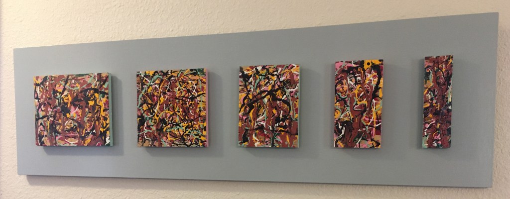 The dimensions of this piece are 13″ tall by 45.5″ wide. It hangs with two hooks and is an assembled composition. Starting with five panels that are 7″ tall of “graduated” widths, that have a warm color pallet with a mint green, cooler accent. The panels are alternately edged with a lighter mint green and a light rose color. The “graduated” panels are suspended above a neutral grey background. They are centered top to bottom and horizontally spaced equally. The backing hangs suspended equidistant from the wall making a solid statement in any room or space.