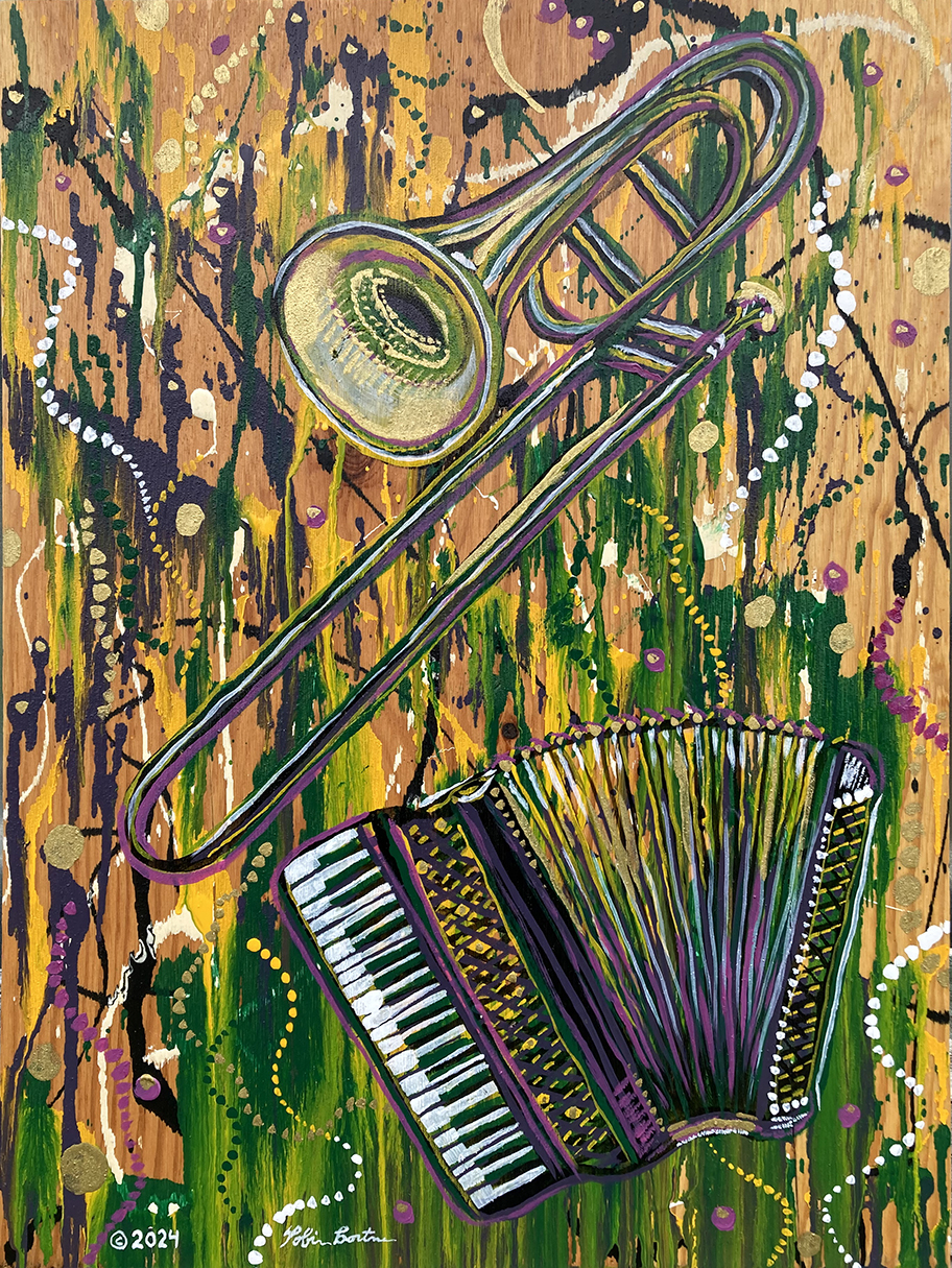 These paintings are done with green, purple and yellow on a varnished pine background. The images are accented with black, white and metallic gold throughout the series
