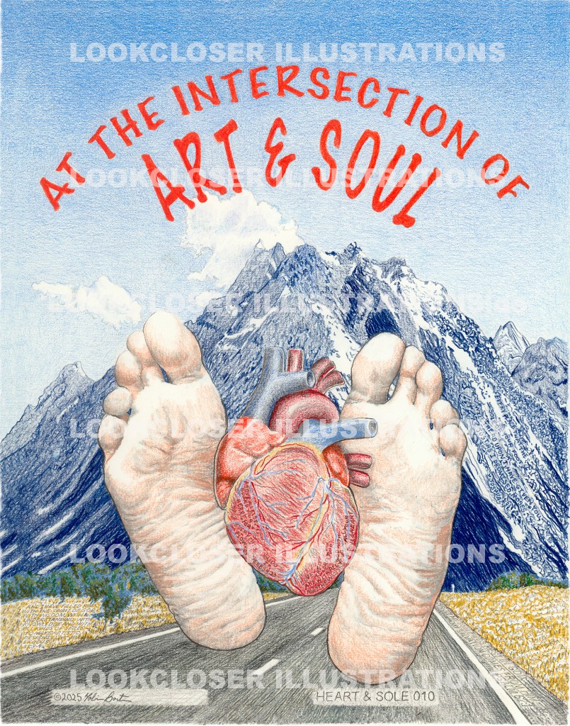 As soon as I heard the phrase, “at the intersection of Art and Soul,” I thought of homonyms for the following nouns: art and soul. The homonyms being the physical heart muscle and the soles of a person’s feet. That would make a great illustration, but how would the intersection work?