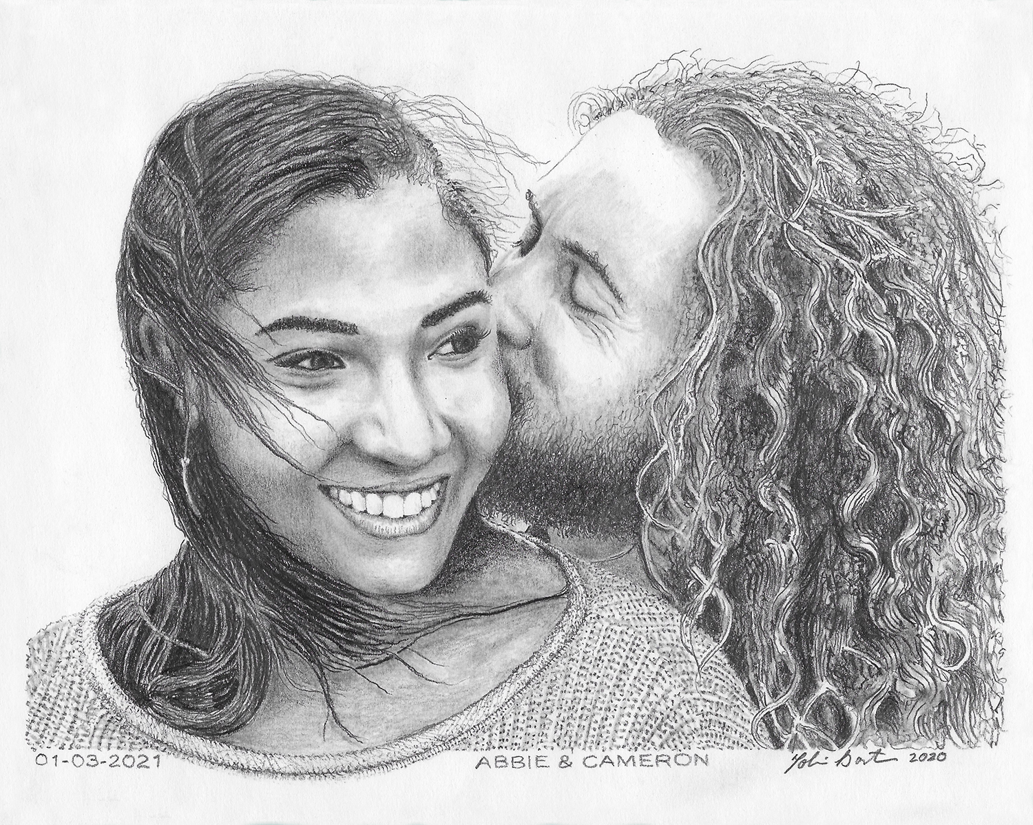 It was difficult to wait to post this on my website until after the wedding. It was so fun to draw this couple, especially this kiss. Why? Because the determination, attention, care, anticipation, intentionality, appreciation, and yes, intimacy Cameron shows during this kiss is obvious. Pandemic weddings have shown all of these.