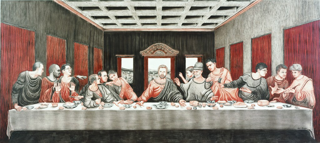 The current location of this original illustration (conte crayon on 24″ x 96″ foam core) is not known. This terra cotta and walnut rendering of Leonardo DaVinci’s The Last Supper was commissioned in the late nineties. The piece would hang in an area occupied by a walnut dining table and several terra cotta pieces of art. The desired difference was that the customer wanted the characters to be “different races, genders and ages of people.” That is why it is entitled The Lamb’s Supper, because of how the book of Revelation describes the reconciliation of creation with its creator. Subject references were chosen for their social and cultural variety and if the position of their face matched one of the thirteen characters in the da Vinci painting.
