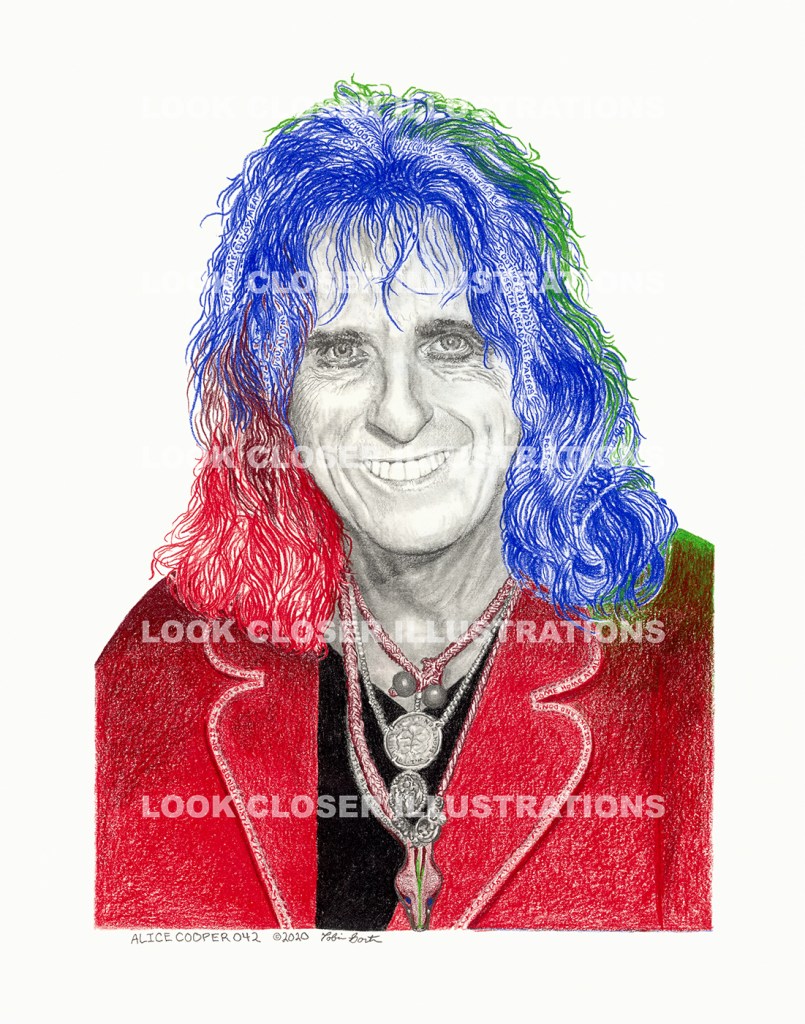 Alice Cooper (02-04-1948, born Vincent Damon Furnier) is an American singer, songwriter, actor, and presidential candidate. His career spans 50 years. With a raspy voice and stage show featuring numerous props including pyrotechnics, guillotines, electric chairs, fake blood, reptiles, baby dolls, and dueling swords, Cooper is considered by music journalists and peers to be “The Godfather of Shock Rock”. He’s drawn equally from horror films, vaudeville, and garage rock to pioneer a macabre and theatrical brand of rock designed to shock audiences.