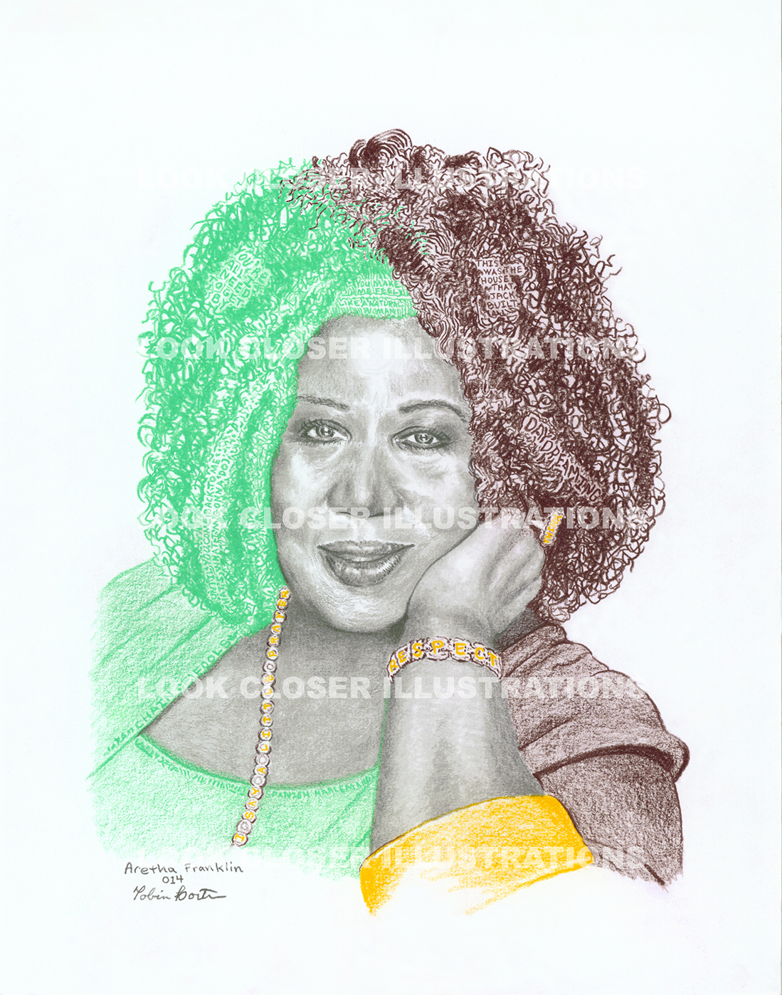 Digital Print on Archival Matte – Original illustration done in graphite and prisma color: True Green as Aretha was PK (preacher’s kid); Spanish Orange, the song Spanish Harlem; and Dark Brown, the darkness of parents separation, divorce, the reflection of that in her music and lyrics