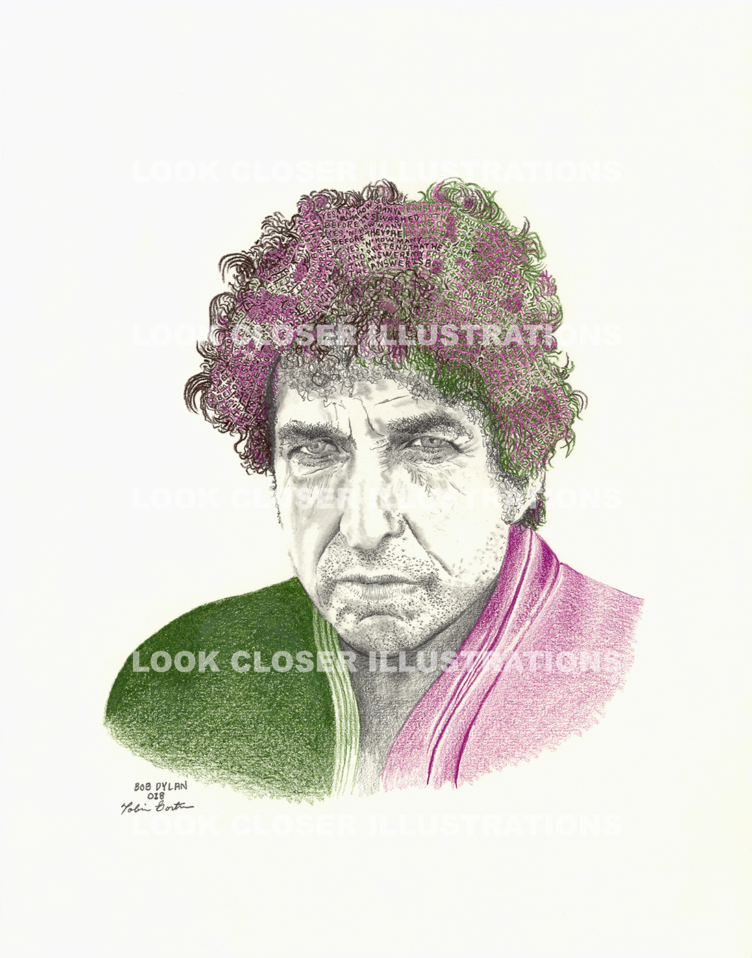 Digital Print on Archival Matte – Original illustration done in graphite and prisma color: Olive Green-it was popular in the ‘60s; Dark Umber-Dylan’s Lyrics are true and somber; and Mulberry for his participation with the Traveling Wilburys (see George Harrison 027).