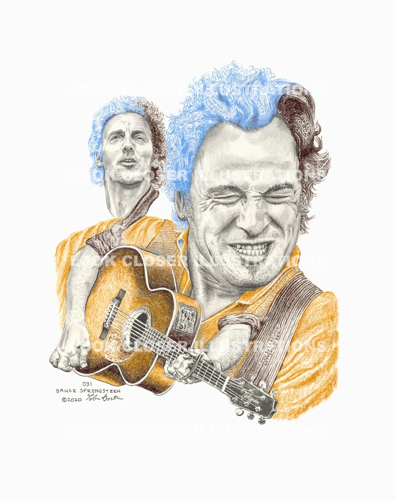Digital Print on Archival Matte – Original illustration done in graphite prisma colors: Dark Umber for Dancing in the Dark; Golden Rod for his Golden Globe Award; Light Currilean Blue for his first single released, Blinded by the Light.