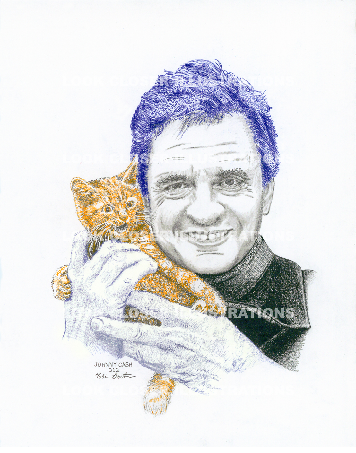 Digital Print on Archival Matte – Original illustration done in graphite and the following Prisma Colors: Black for the “Man in Black”; Violet Blue for the “Folsom Prison Blues”; and Yellow Orange for the tabby cat from the song, “Mean Eyed Cat”; and the hands are in Indigo Blue.