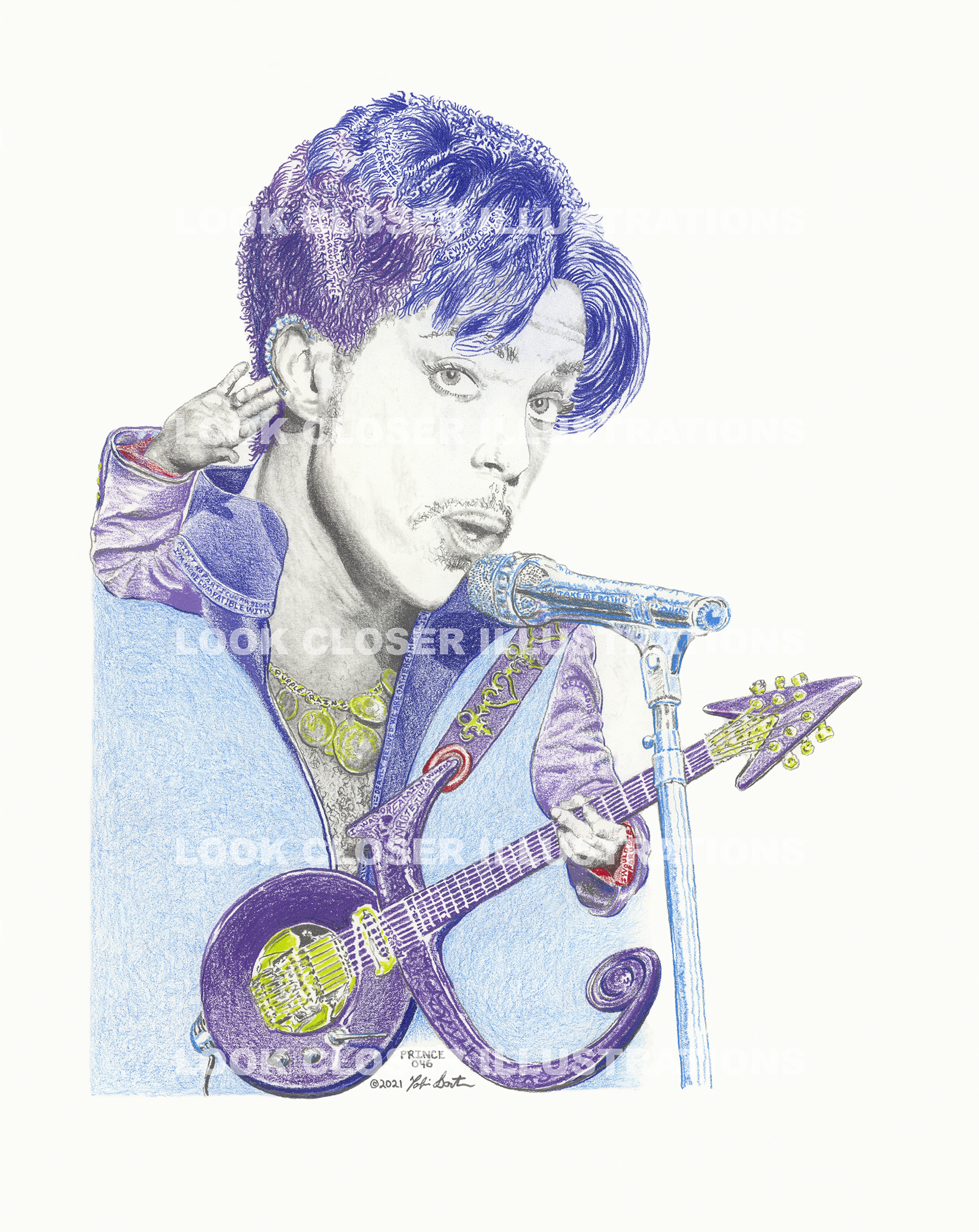 Digital Print on Archival Matte – Original illustration done in graphite and the following Prisma Colors: Violet for “An ocean of violets in bloom” (When Doves Cry);Blue Violet and Parma Violet for two references – “The sky was all purple. . . “(1999), “Let’s look for the purple banana” (Let’s Go Crazy); Crimson Red for Little Red Corvette; Chartreuse because it is an androgynous color; and True Blue for the induction into the Rhythm and Blues Music Hall of Fame.