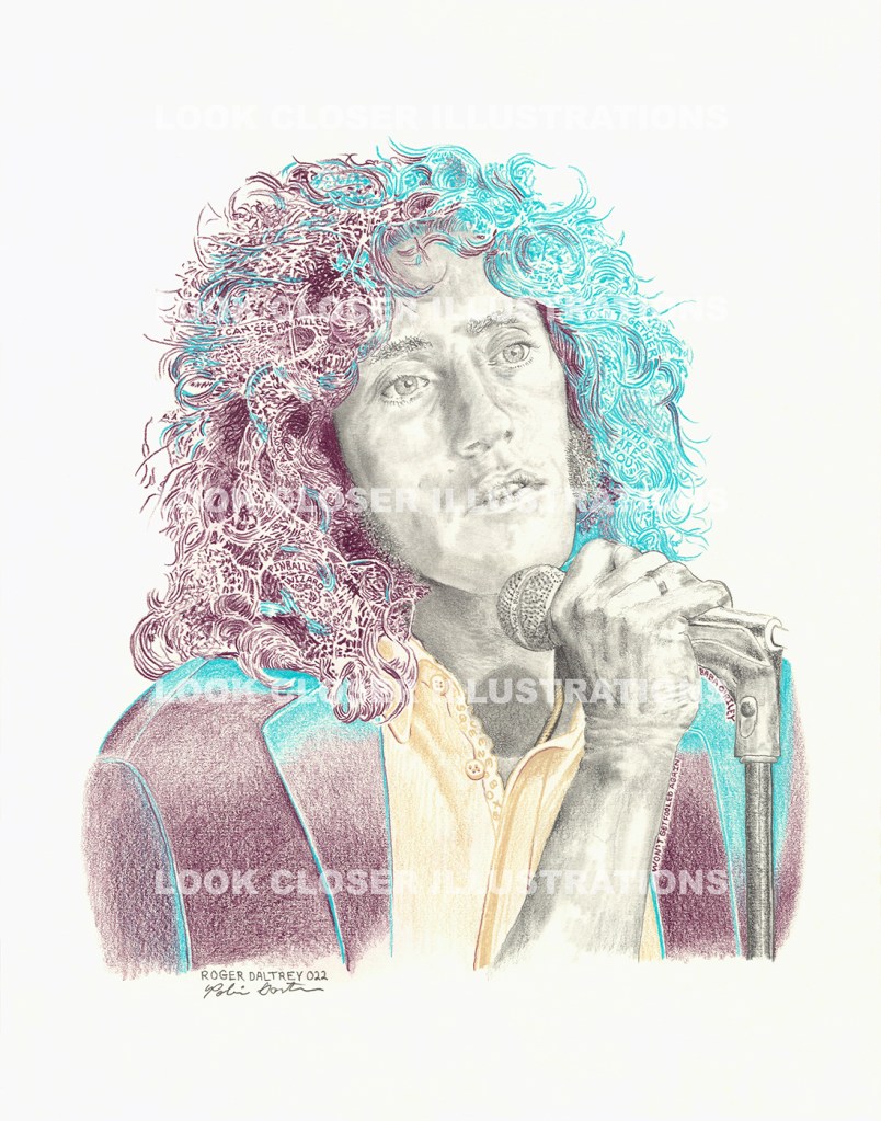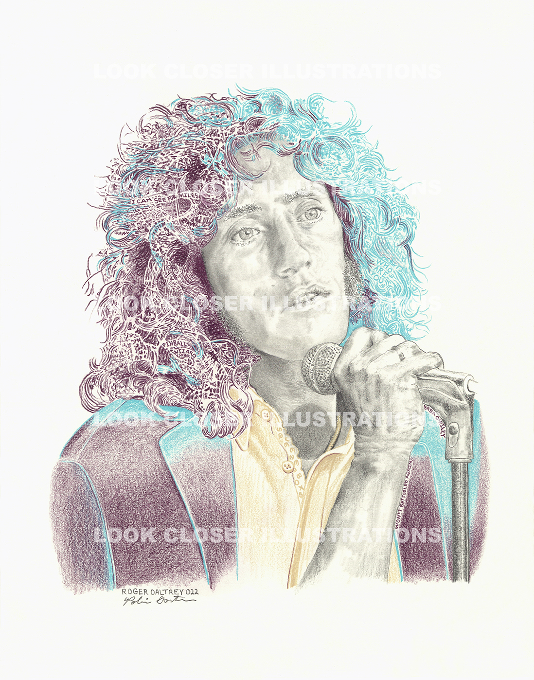 Digital Print on Archival Matte – Original illustration done in graphite and prisma colors: Black Cherry (he made a cherry red Stratocaster guitar from a block of wood); Light Aqua; and Ginger Root compliment Black Cherry – In an interview Daltrey claimed real music makes you want to fight. The clenched fist around the mic represents this principle.