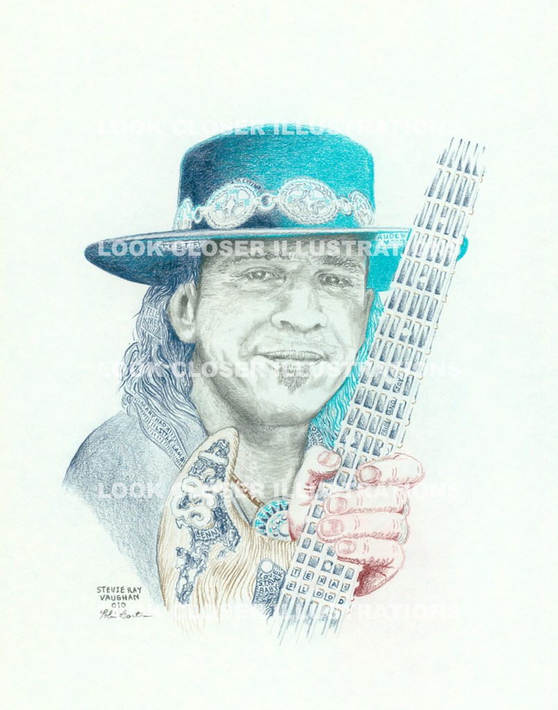 Digital Print on Archival Matte – Original illustration done in graphite and the following Prisma Colors: Aqua Marine; Indigo Blue; Tuscan Red; and Light Umber. Aqua Marine and Indigo Blue as he was the best Blues guitarist to ever live. Indigo Blue and Tuscan Red are typical Southwestern colors. Light Umber is used to illustrate Lenny, SRV’s guitar, as it was named for the woman who jilted Stevie while he was touring.