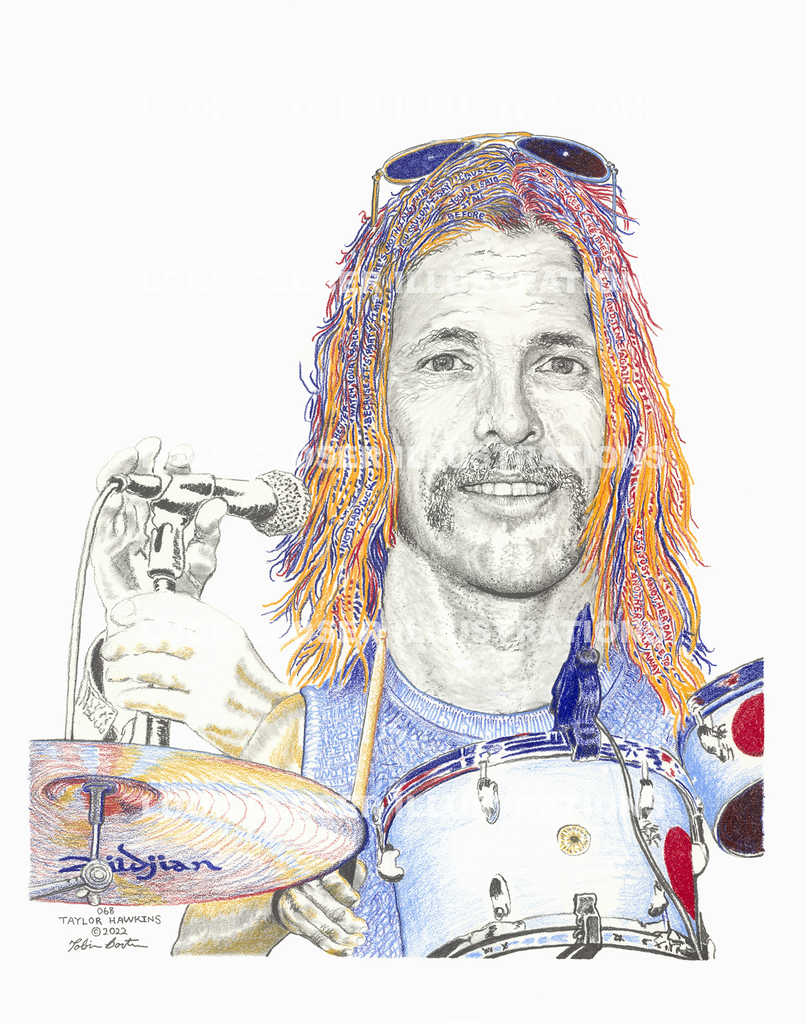 Digital Print on Archival Matte – Original illustration done in graphite and prisma colors: Crimson Red for the album, Red Light Fever; Violet Blue, Light Cerelean Blue; Yellow Ochre; and Yellowed Orange. These colors were used on the Dave Grohl illustration.