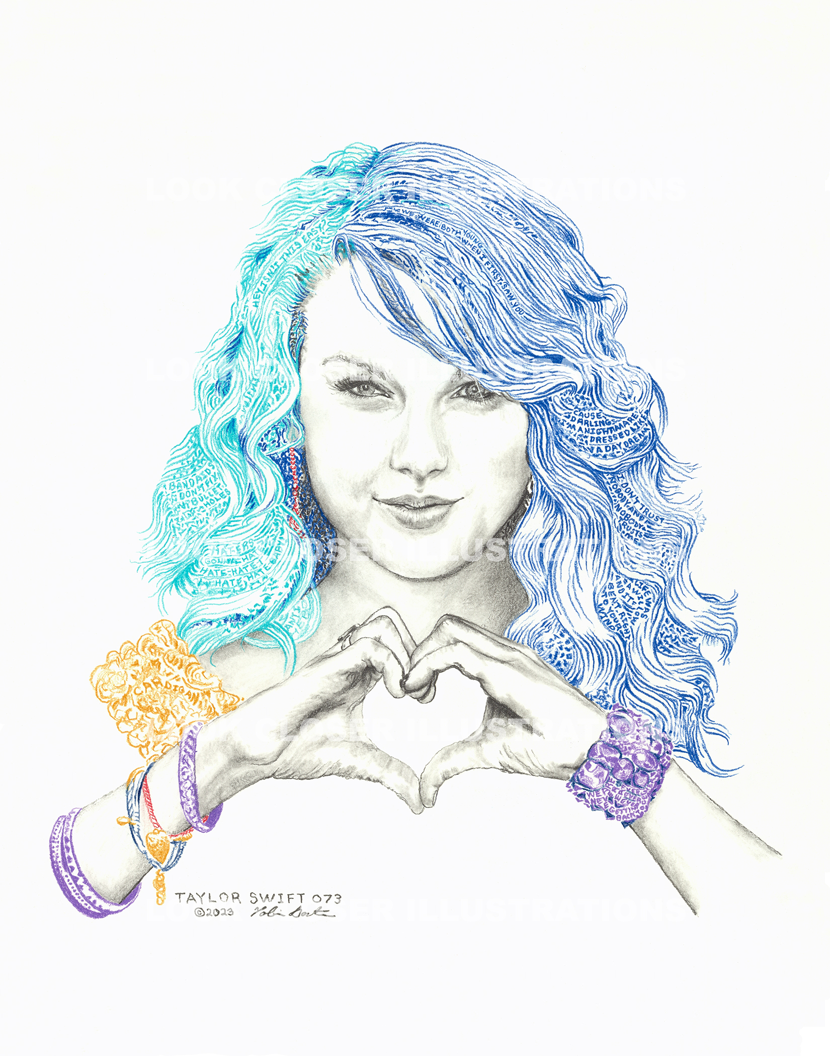 Digital Print on Archival Matte – Original illustration done in graphite and the following Prisma Colors: Crimson for the album, “Red” and for the song, Bad Blood;Copenhagen Blue compensation for Country Music fans; Indigo Blue for the album, “Midnights”; Light Aqua, Parma Violet and Goldenrod as compliment colors.